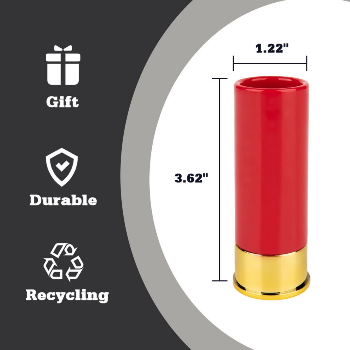 This unique 12-Gauge Shot Glass Shell Casing brings rugged style to your barware collection. Crafted from authentic polished brass shotgun shell casings, each 3.6" tall glass holds a standard 2 oz shot portion. The heavy-duty construction features a weighted base for stability, with the original shell markings preserved for authentic appeal. Perfect for hunting lodges, man caves, or outdoor enthusiasts. Ideal for whiskey, tequila, or other spirits, they combine functionality with conversation-starting novelty.